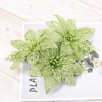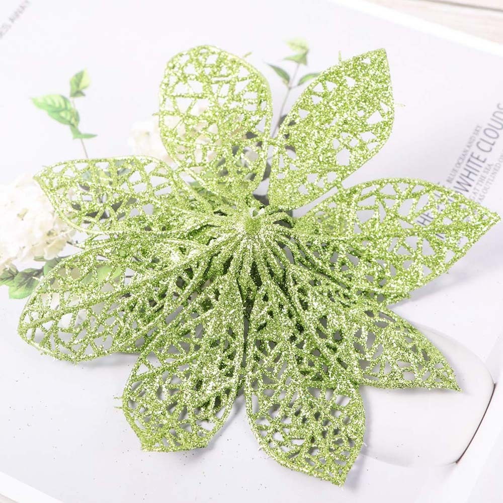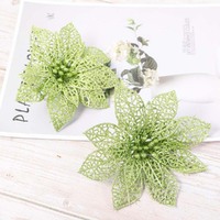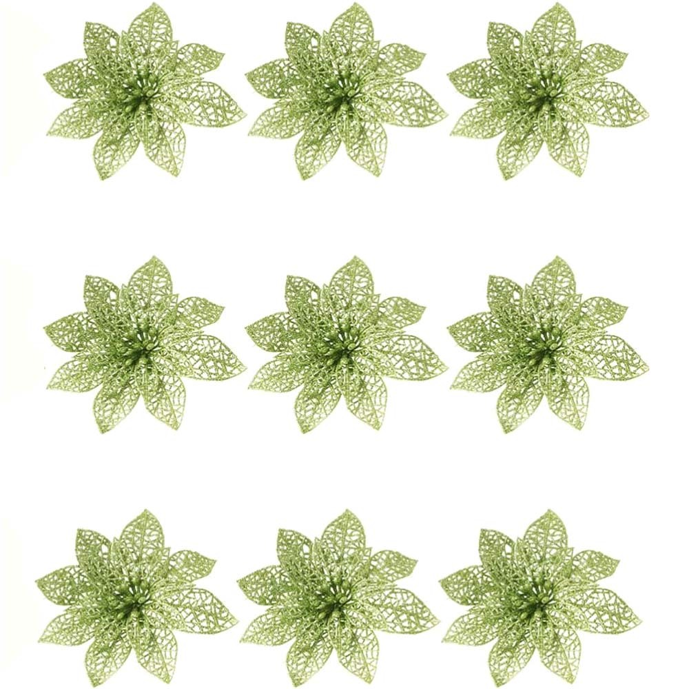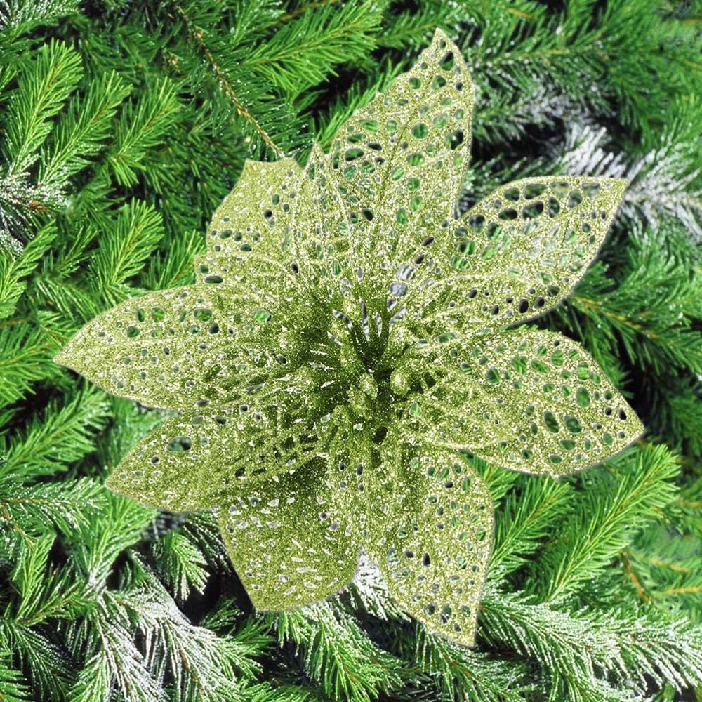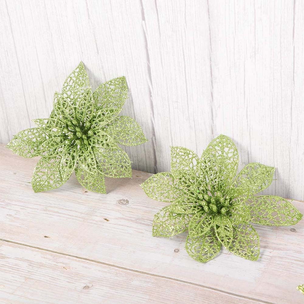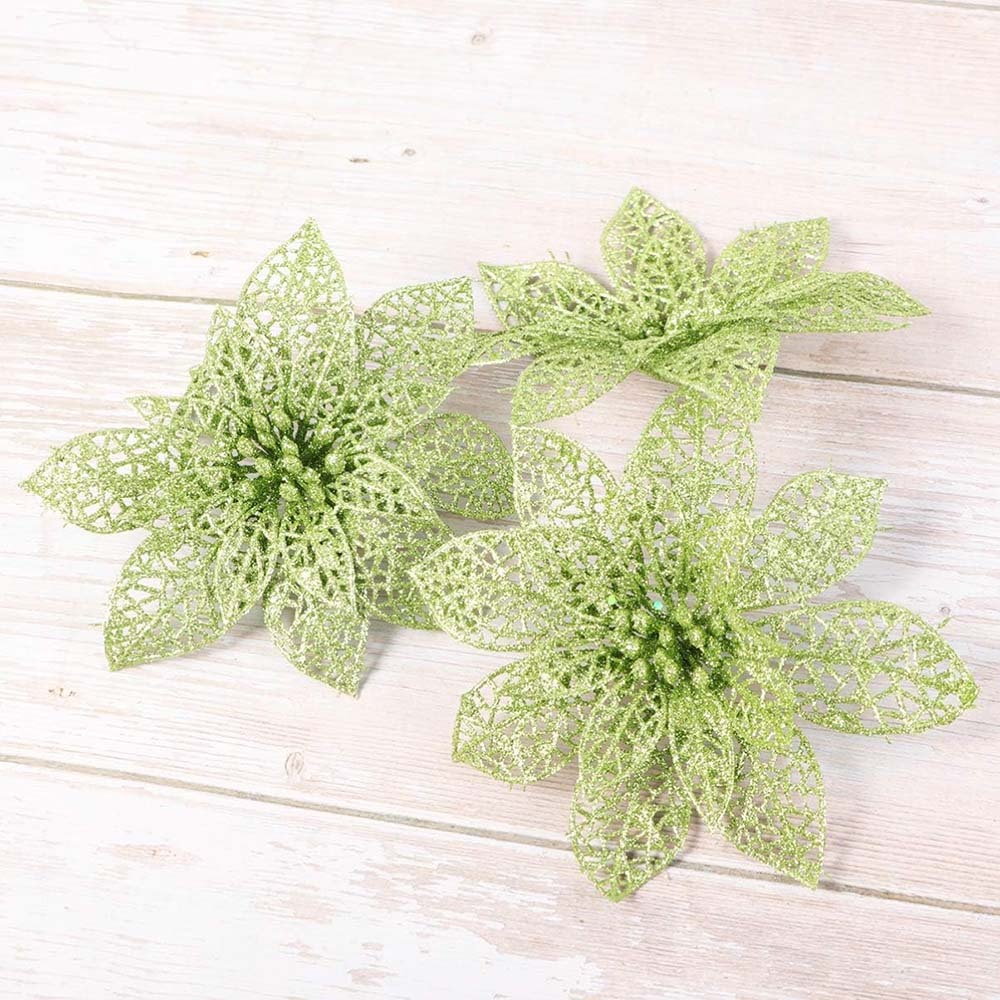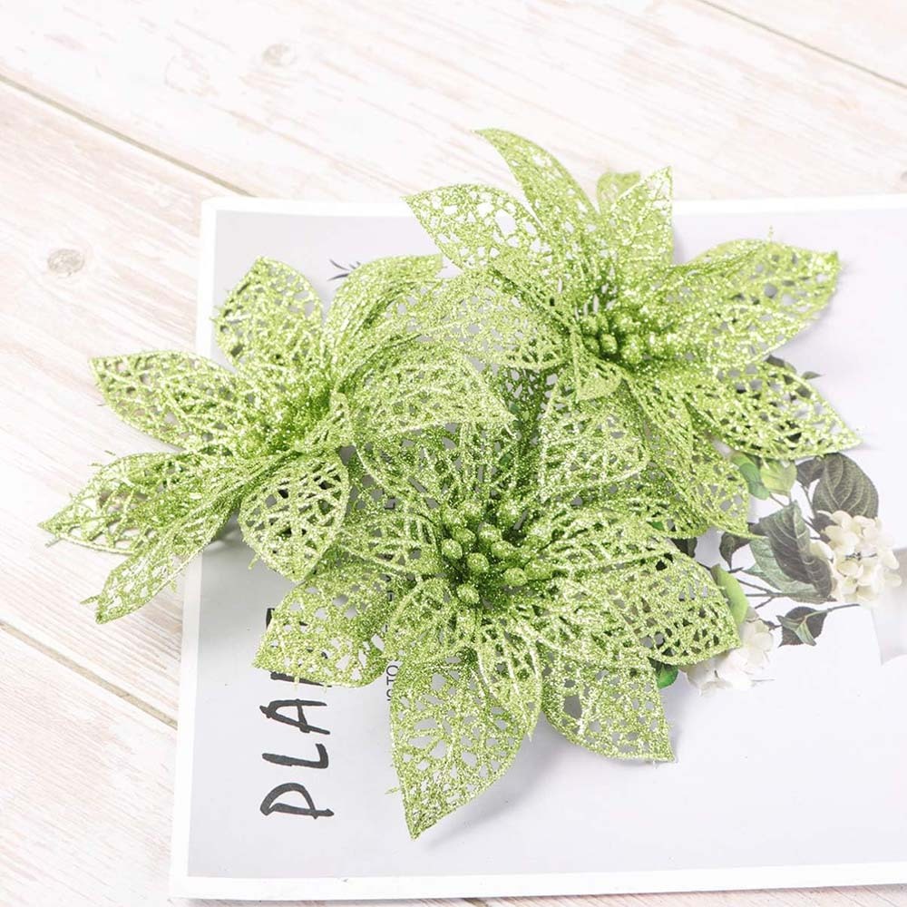 10Pcs Glitter Poinsettia Christmas Tree Ornaments Xmas Artificial Flowers Decor-Green