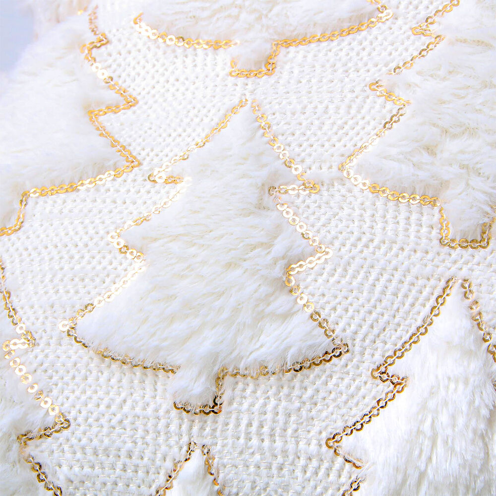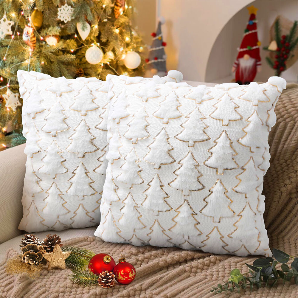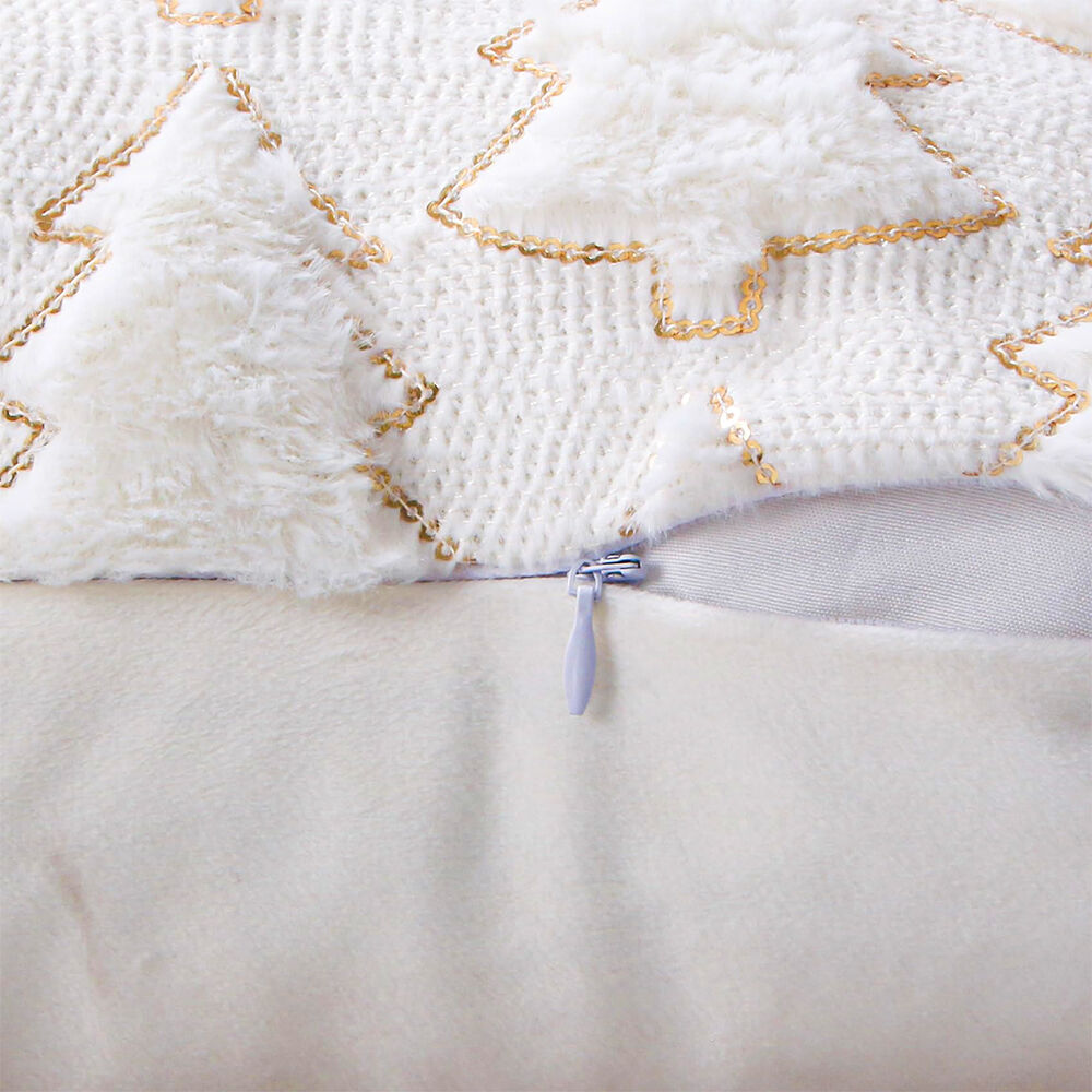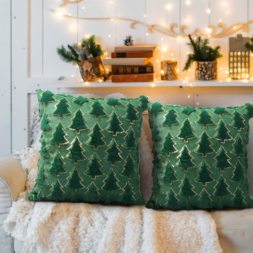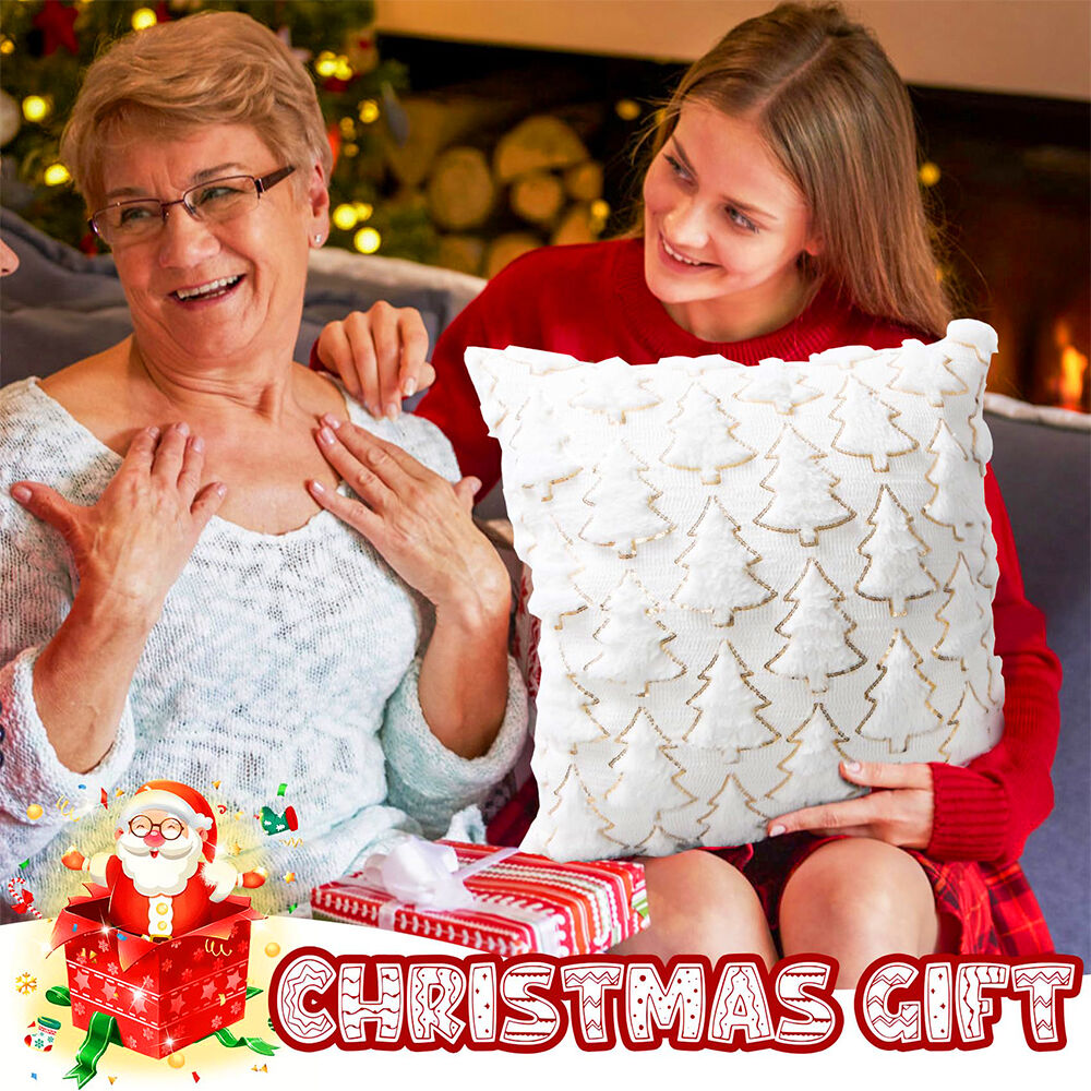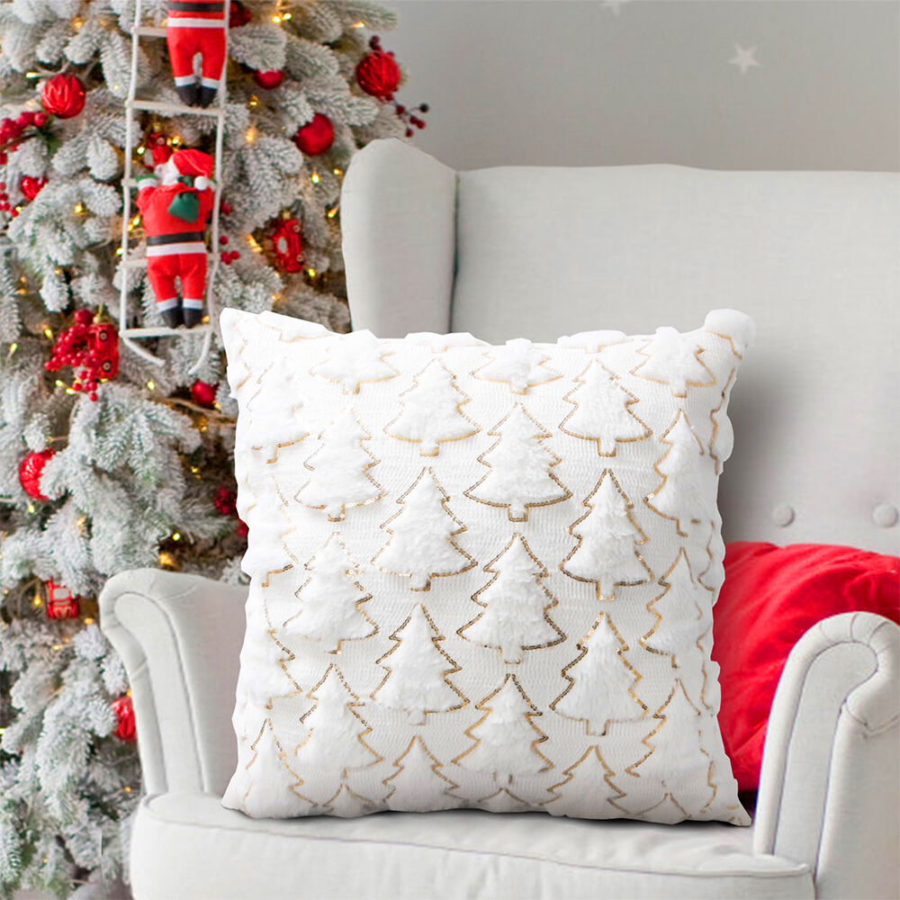 - The Christmas pillow covers best of the standout features is the sequin Christmas tree design. The Christmas trees have a 3d effect as cushion covers are furry and they are also surrounded by pretty gold sequins. Christmas pillow covers not just eye-catching, but also adds a fun, interactive element. The sequins shimmer and change colors with movement, giving the covers a dynamic, magical quality that catches the light and draws attention.
