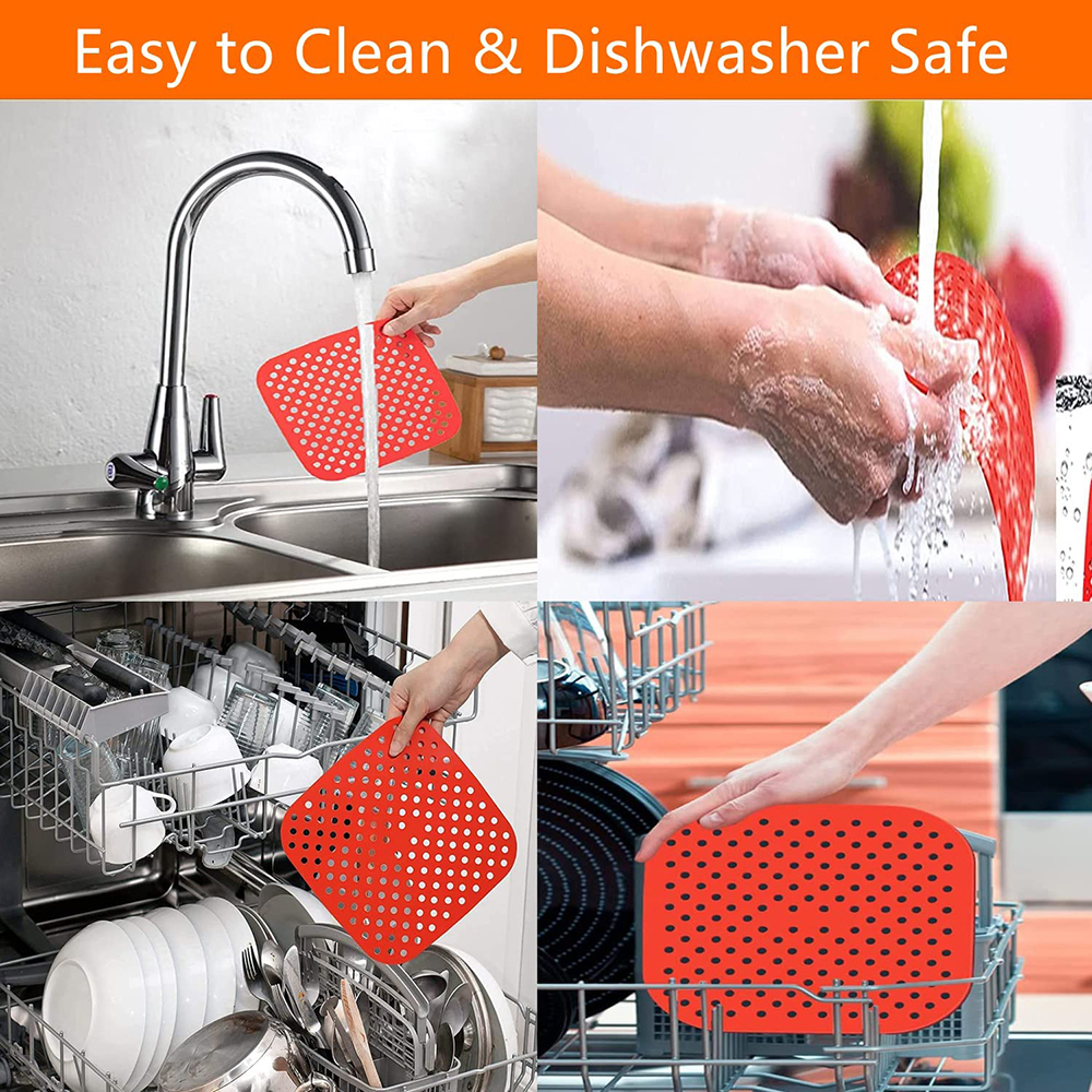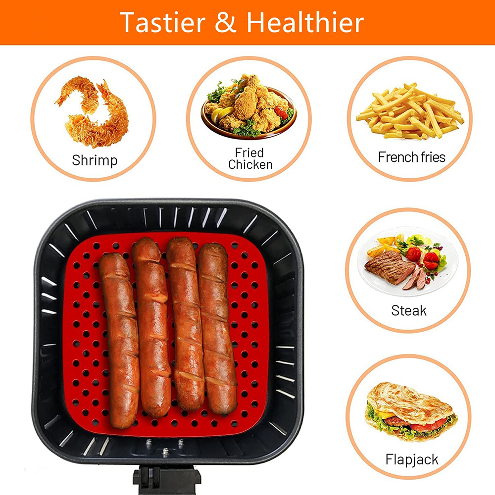 The silicone air fryer pad is non-stick and it keeps food from sticking to your air fryer basket, racks or trays. Silicone liners also protect and extends the life of your air fryer baskets and trays.