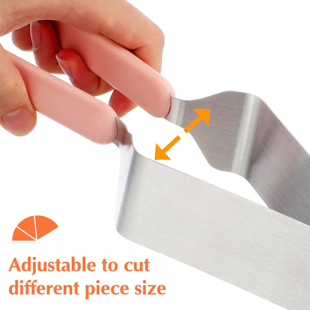 Cake cutter is easier to use than traditional cake knife and spatula; cut, grab and serve cakes with just one knife, has an adjustable design to cut different sizes of cake; it cuts even and beautiful slices
