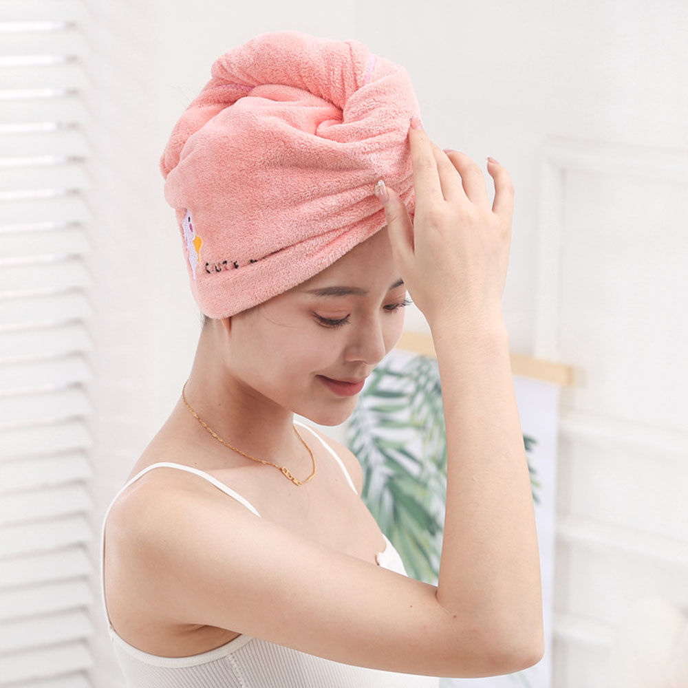 2Pcs Embroidery Style Hair Drying Cap Coral Fleece Thickened Bathroom Hair Towel-Pink