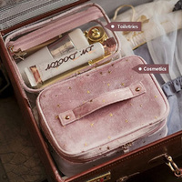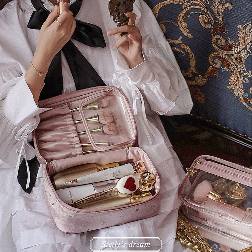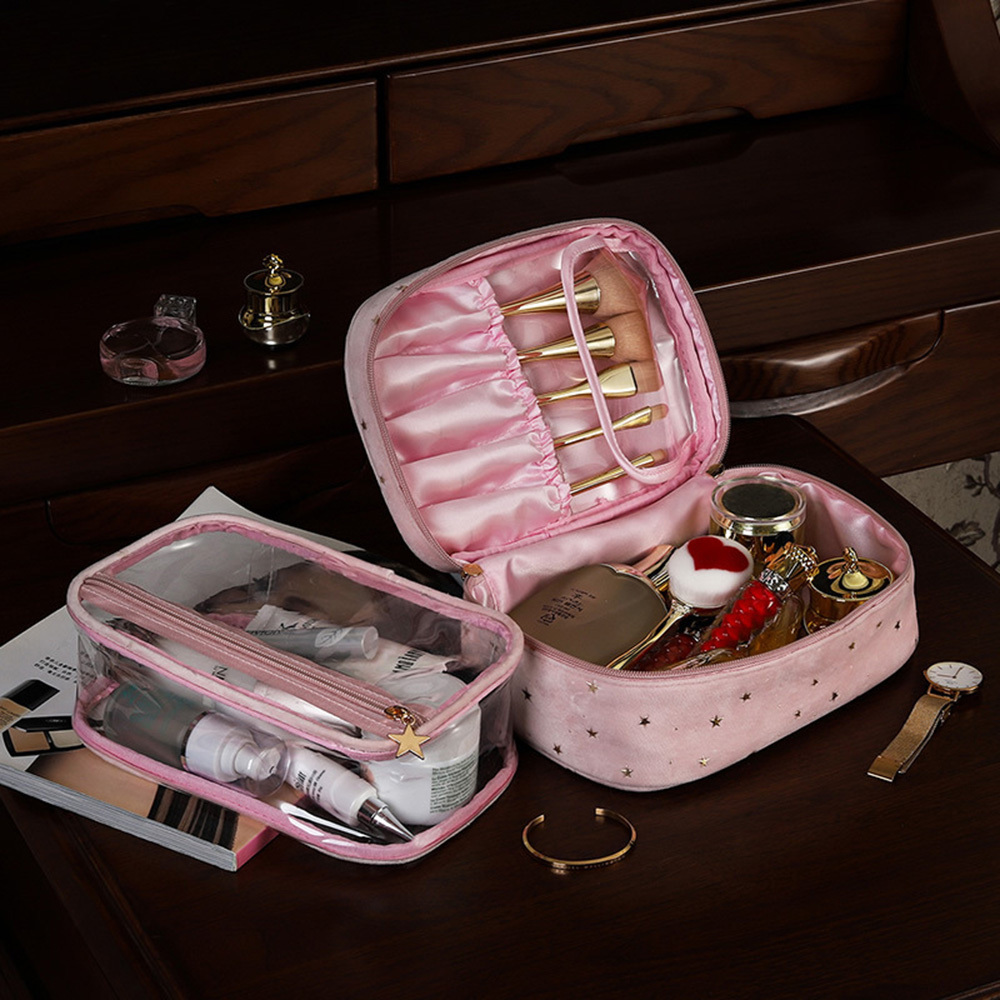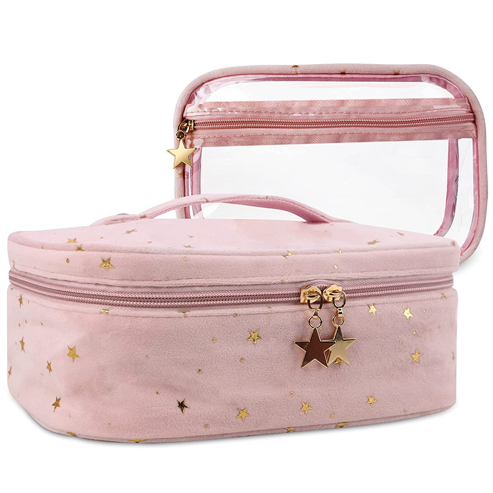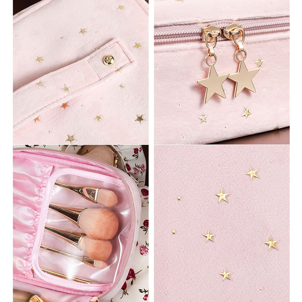 This toiletry bag is made of soft, skin-friendly, luxurious and strong fabric. Open the cosmetic bag with a light touch, soft and comfortable, as warm as baby's skin. The gold-plated stars dotted outside are dazzling and warm. Not only good looking, but also durable.