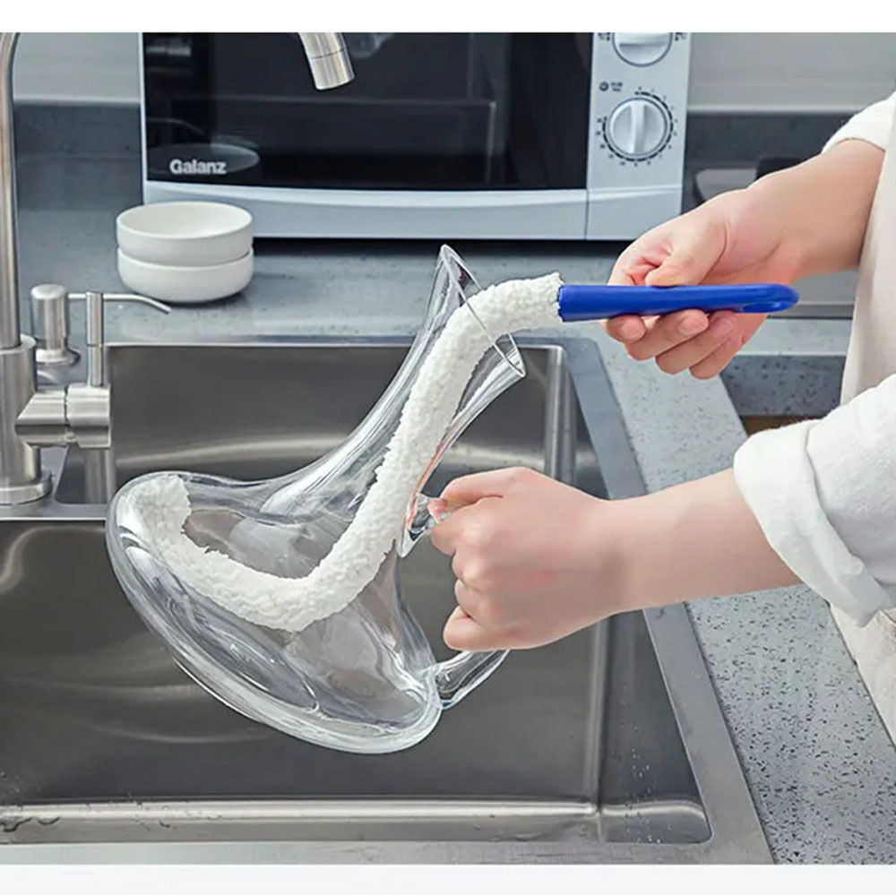 Flexible,soft,lightweight,reusable,long enough to clean the dust, dirt on the bottom of the glass. Multi-function household cleaning tools flexible wine glass cleaning brush tumblers long handle sponge cleaning brush ideal for the cleaning of wine decanters, goblets, glasses, cups, etc.