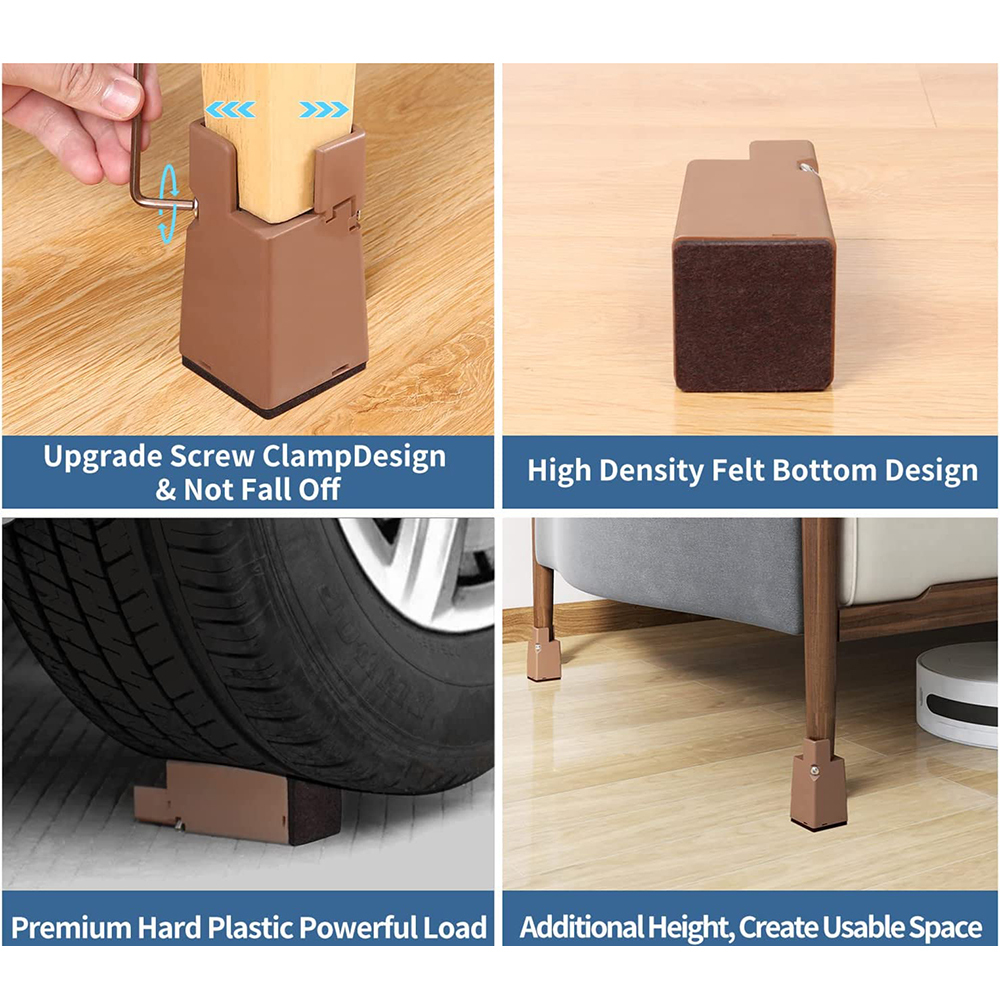• Use screw clip adjust fixing, wrapped furniture legs are not easy to fall. Adjustable sofa/couch/table/desk risers is easy to install.