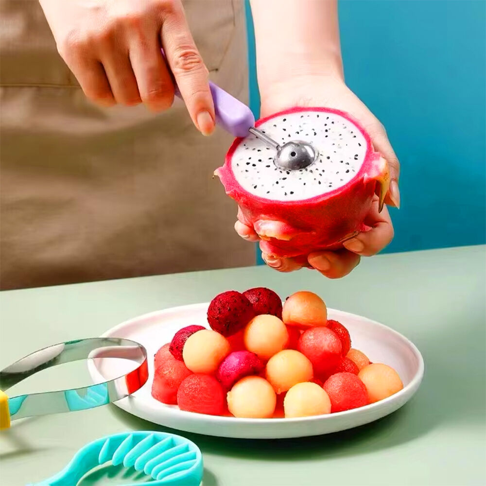 This melon baller scoop set is a set of carving, digging pulp, seeding and pulp separation and other functions in one, its diversified functions can meet the needs of different fruit processing, so that the presentation of fruit is more diverse.