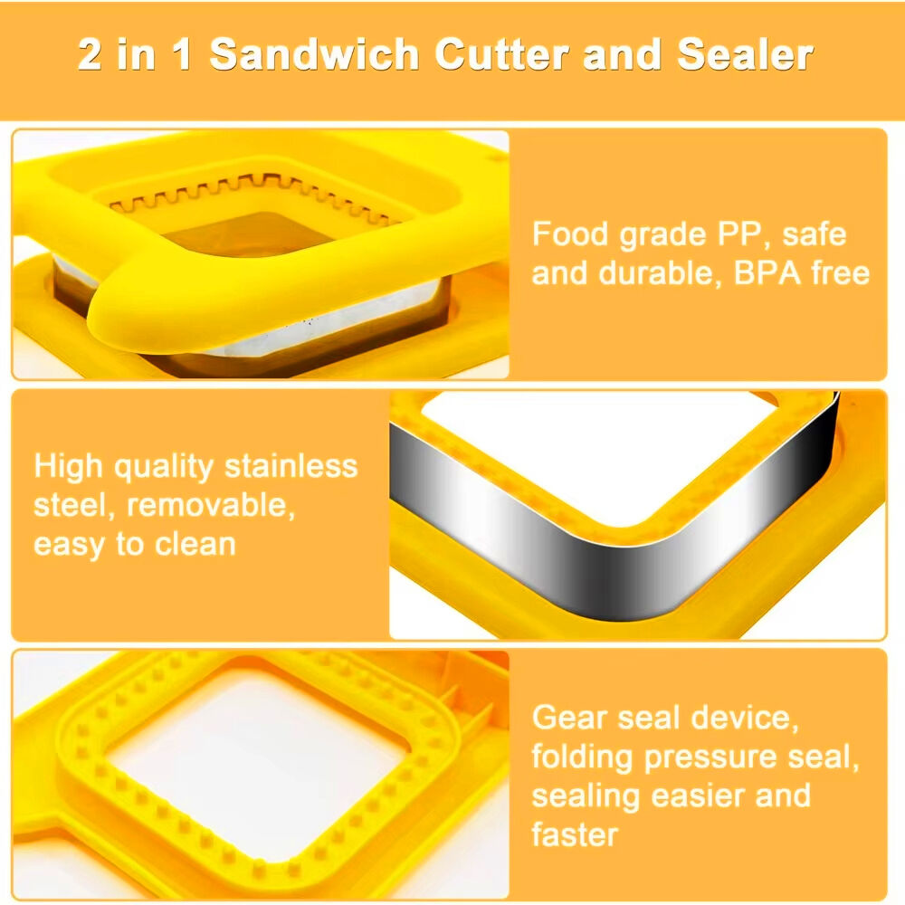 • 2 in 1 sandwich cutter:This crustless sandwich maker is easy to use. You can make a sandwich in just two steps. Step 1, fill the bread with whatever you want.step 2: Press the integrated design of cutting and sealing.a sharp blade will create pocket sandwich shape, and seal the edges of the sandwich.