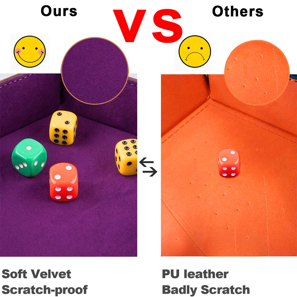 • Unique construction - dice tray made of velvet and PU leather material, the colorful velvet lining and the outer leather are combined by stitching craftwork, and the dice tray with metal snaps in the 6 corners, easy to snap together and collapse