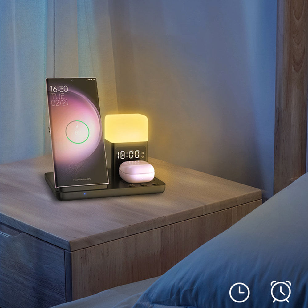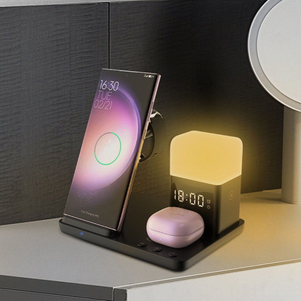 The wireless charging station for Samsung has wireless charger, 12H digital alarm clock and a clock, three different modes of adjustable night lights functions. You can charge your phone, and Galaxy watch and buds simultaneously. fast wireless watch charger for multiple devices to let your desktop get rid of messy charging cables.
