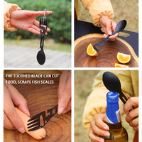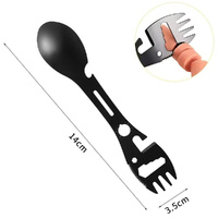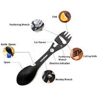 Stainless steel 9-in-1 functionality spork with cutting knife, spoon, bottle/can opener, positioning wrench, monkey wrench, and direction indication, perfect for outdoor survival activities.
