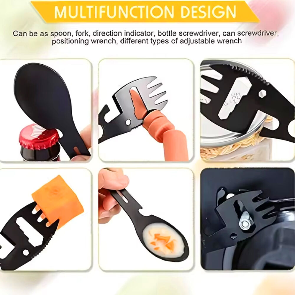 • Versatile functionality: 9in 1 multifunctional utensils, includes spoon, fork, can opener, bottle opener, hex wrench, utility knife, compass, adjustable wrench and so on.