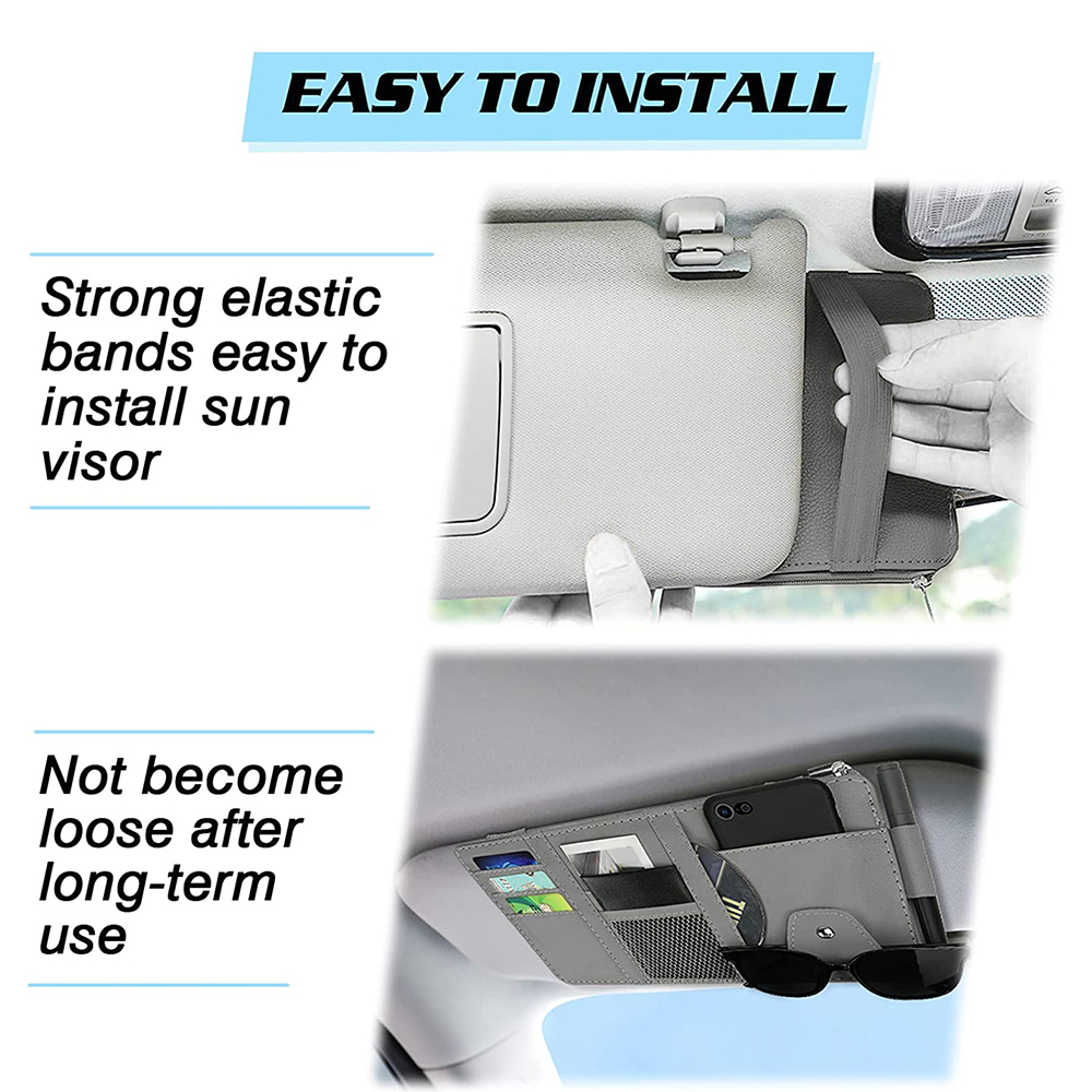 • Premium Materials - Auto visor organizer made of high quality durable PU Leather. No smell, liner board flexible and sturdy. Fine leather veins blend perfectly with your car.