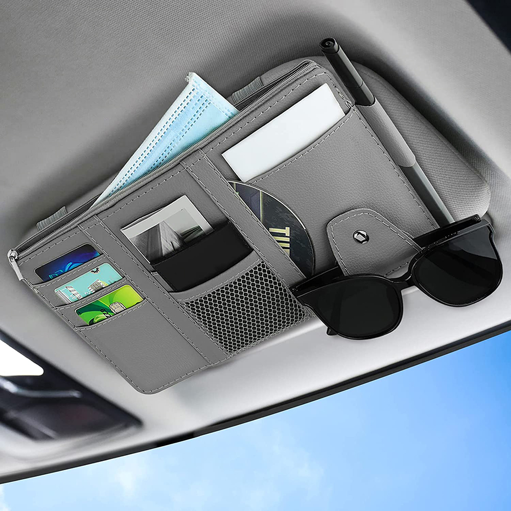 Car Sun Visor Organizer Leather Organizer Sunglass Holder with Zipper Pocket-Gray