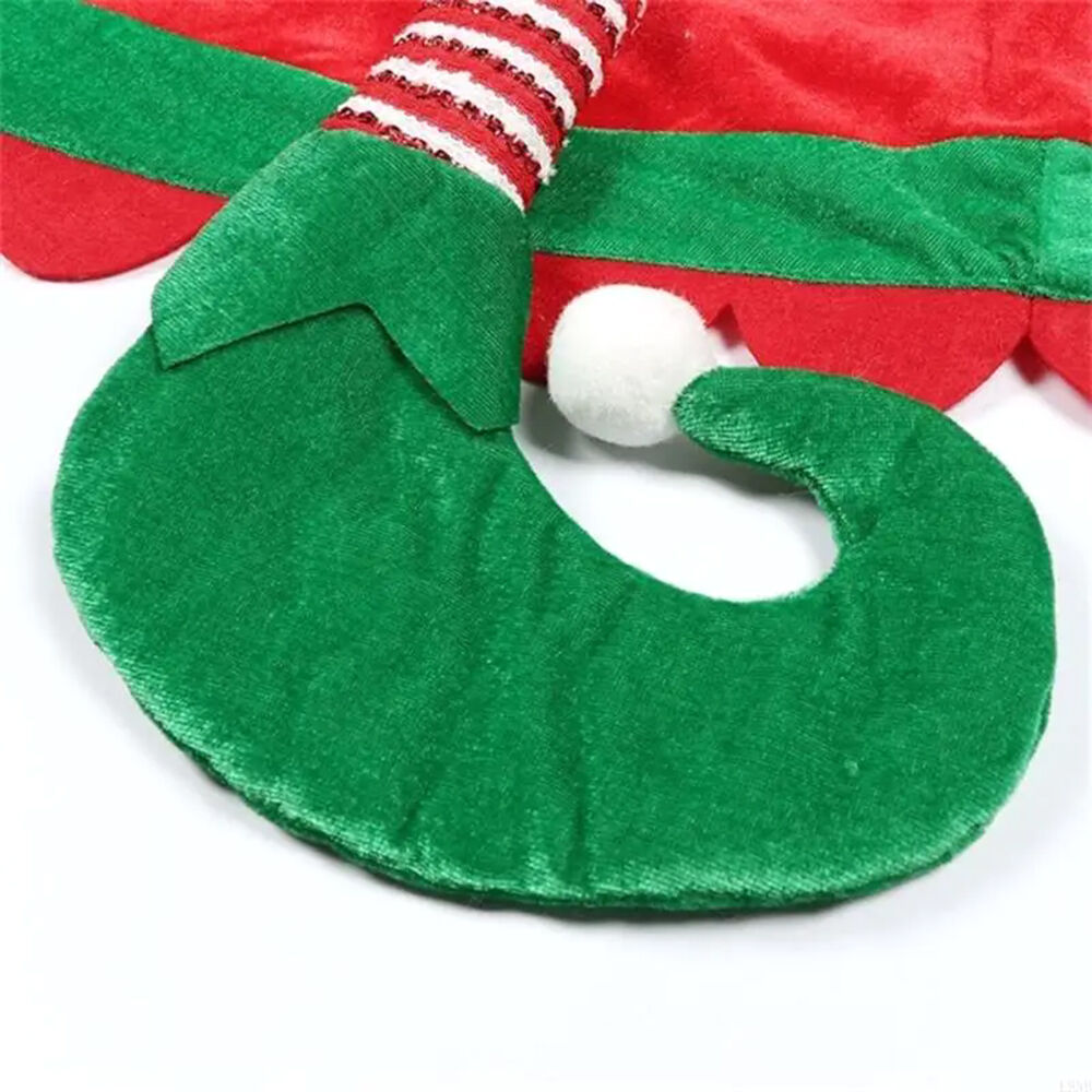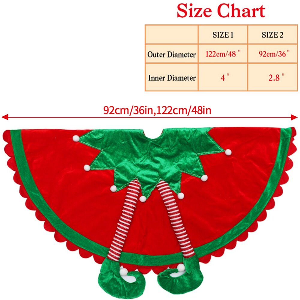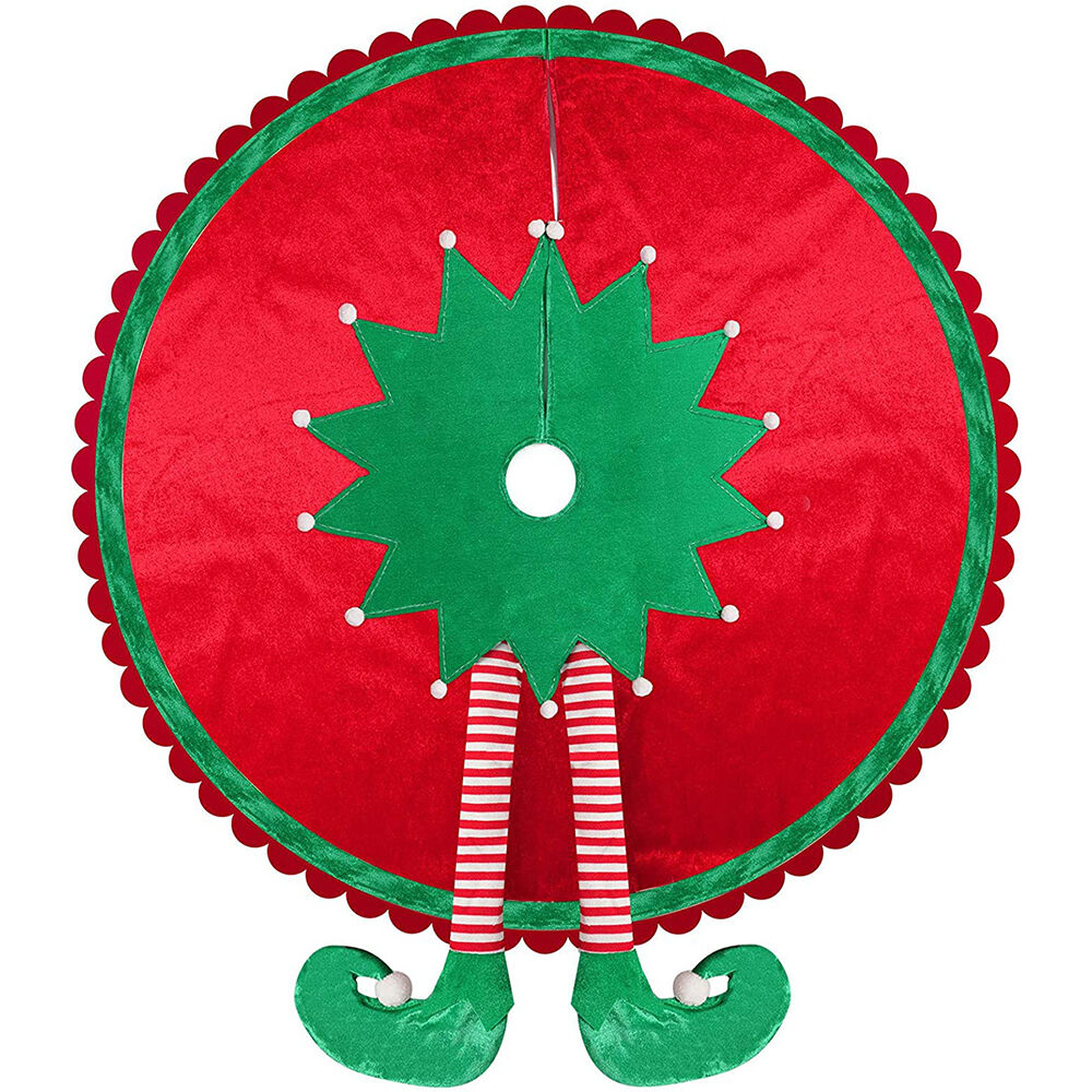 The for elf-themed Christmas tree skirt features a vibrant red and green color scheme, enhancing the holiday for spirit and adding a cozy touch to your home decor with its classic design.