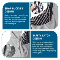 • Design with two pairs of snap buckles to the body of the bag, and a special safety latch in the backpack, can prevent your pet from falling out. So you don't have to worry about dog and cat jumping off naughty.