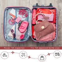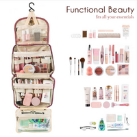 This Travel Makeup Bag is spacious enough for you to fill it up with all your essentials and save space in your suitcase; the bag can be hung using the metal hook bag chain or bag handle for convenience and portability; this travel bag includes a mesh pocket so you can store travel-size toiletries that need to breathe