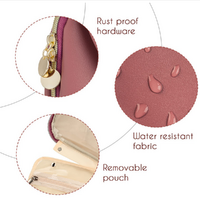 • Hanging design,thanks to its robust hook, you can hang this toiletry bags for traveling women anywhere you go. You can safely hang it in the bathroom too, because it can repel water & is easy to wipe