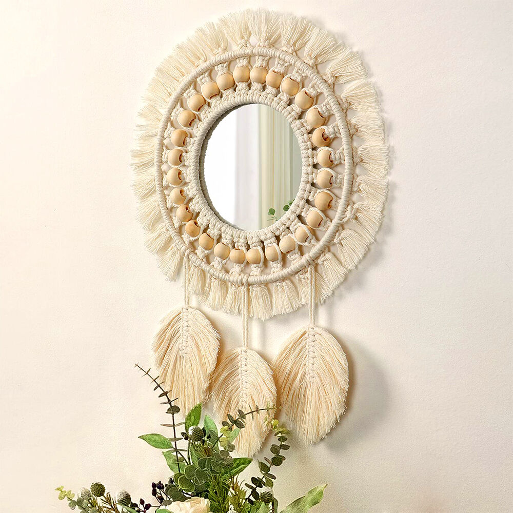 Hanging Wall Mirror-Boho Macrame Fringe Round Decorative Mirror With Wood Beads Feather Pendant
