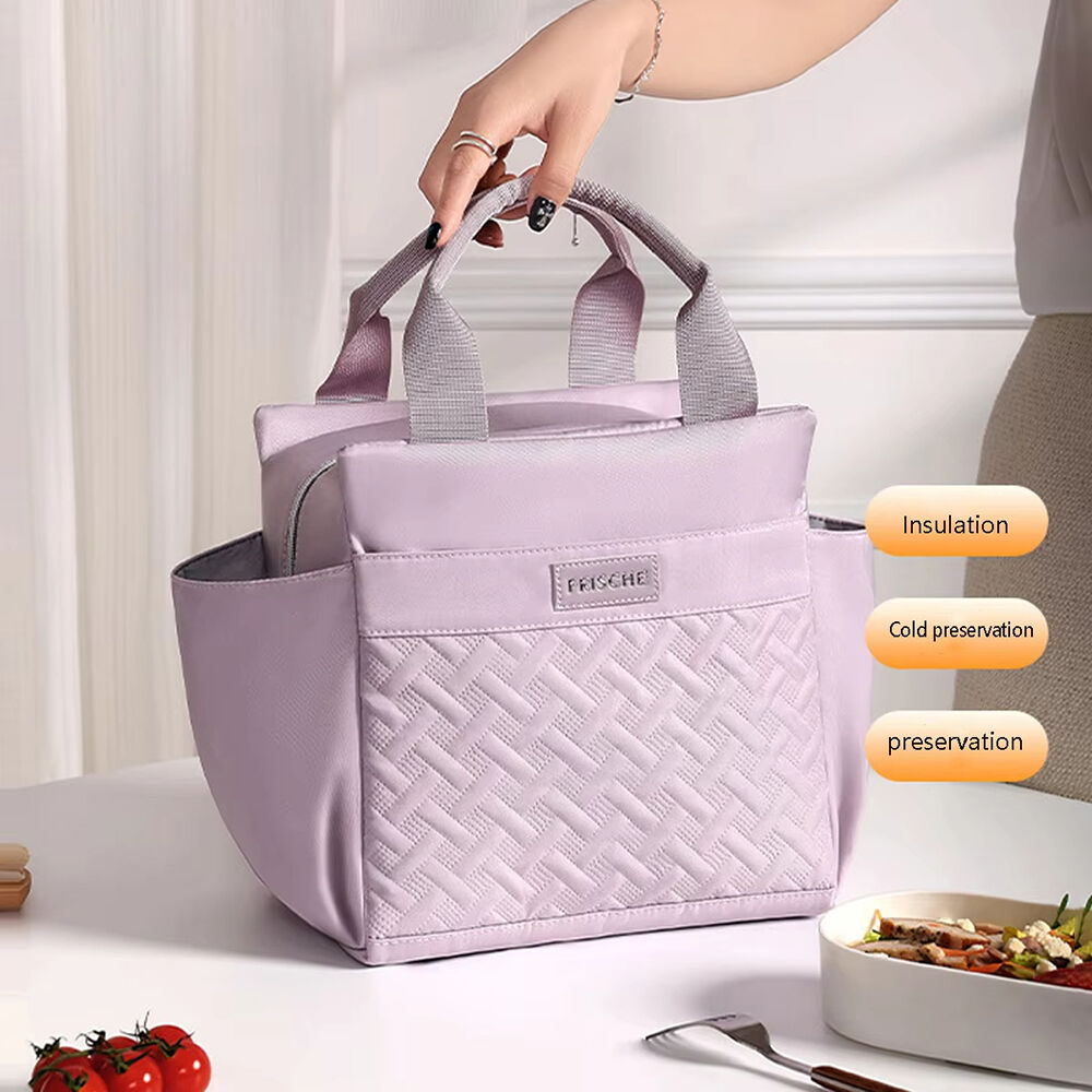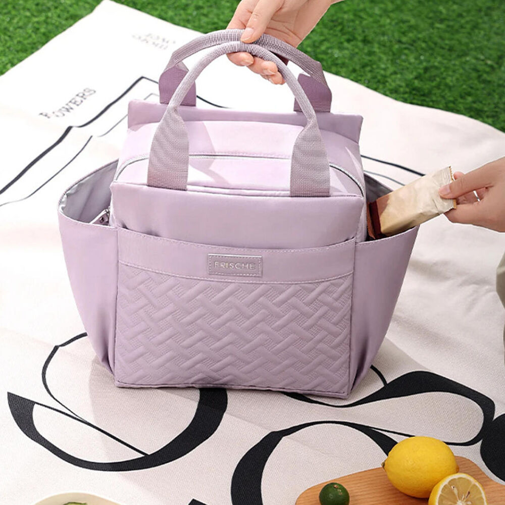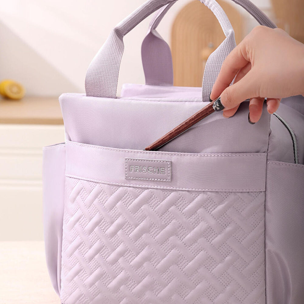 • Fashion Women Lunch Bag - lunch bag dimensions (25*24*17.5cm) with a main spacious space to store and keep fresh all your daily essentials. Two side pockets are perfect for storing your bottles and umbrella. Two front pockets and two back pockets are perfect for storing your tissues, snacks, cell phones, keys, cards, knives and forks, etc.