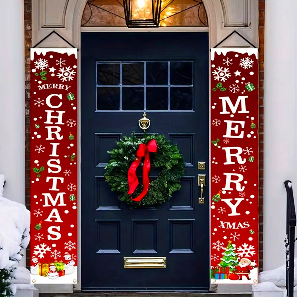 This hanging banner features a vibrant red and white color scheme with snowflakes and a Christmas tree, perfectly capturing the holiday spirit and adding a cheerful touch to your decorations.