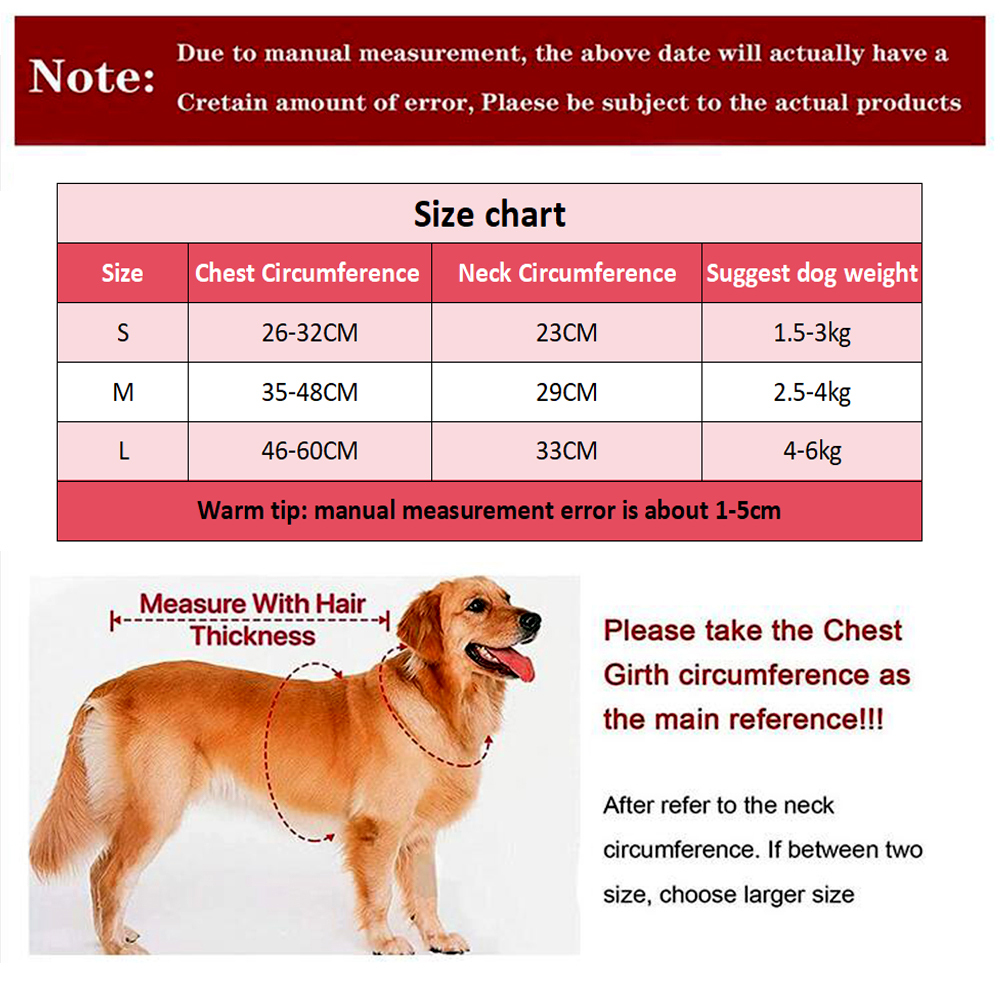 • S-fit for pets with a chest girth(26-32CM),neck girth(23CM), weighing between (1.5-2.5KG).