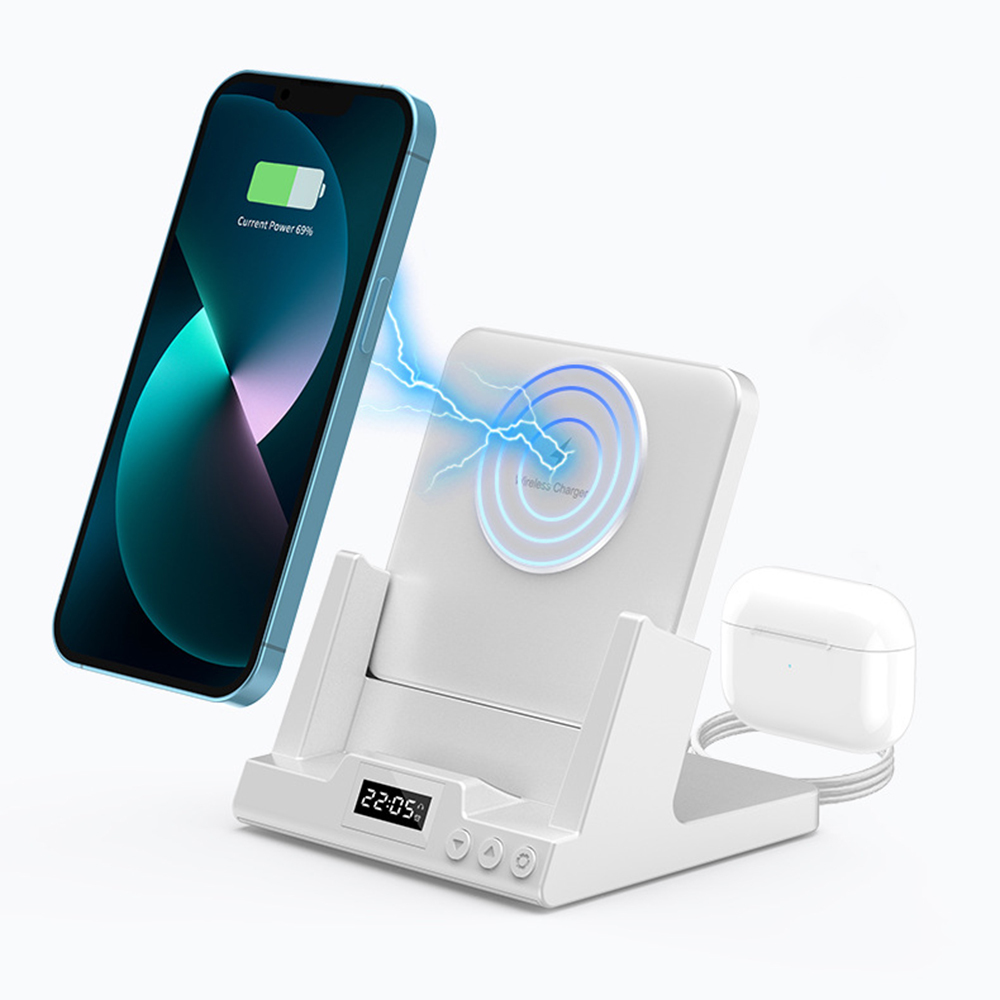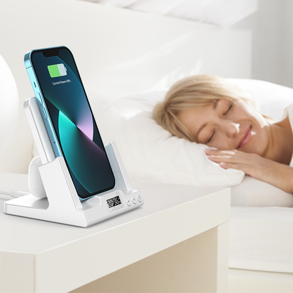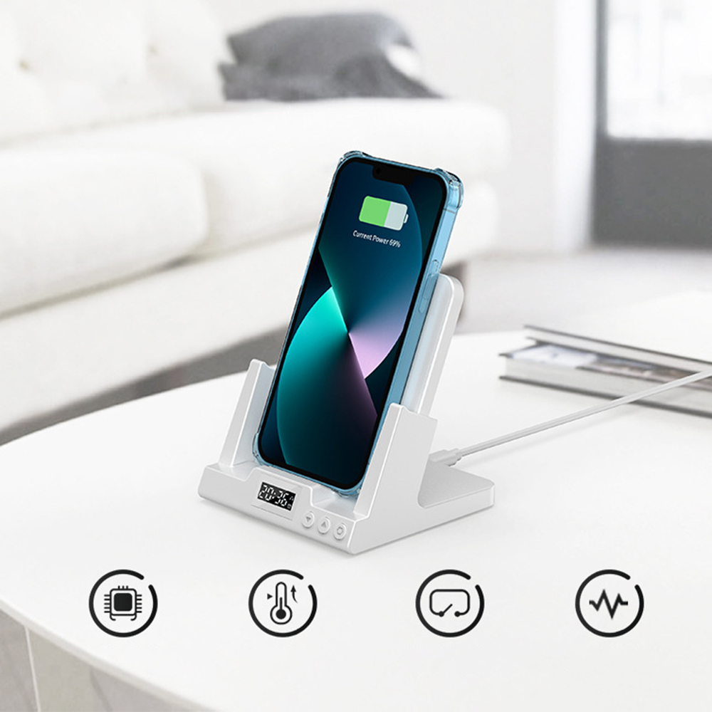 • Product function: Support QI compatible mobile phone wireless charging, Bluetooth headset charging, equipped with clocks and alarm clocks.