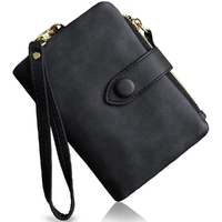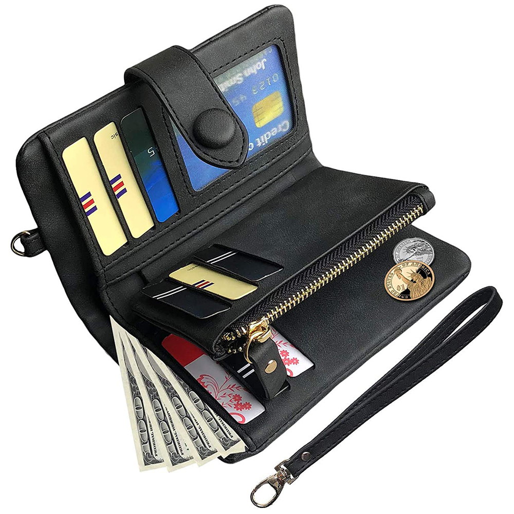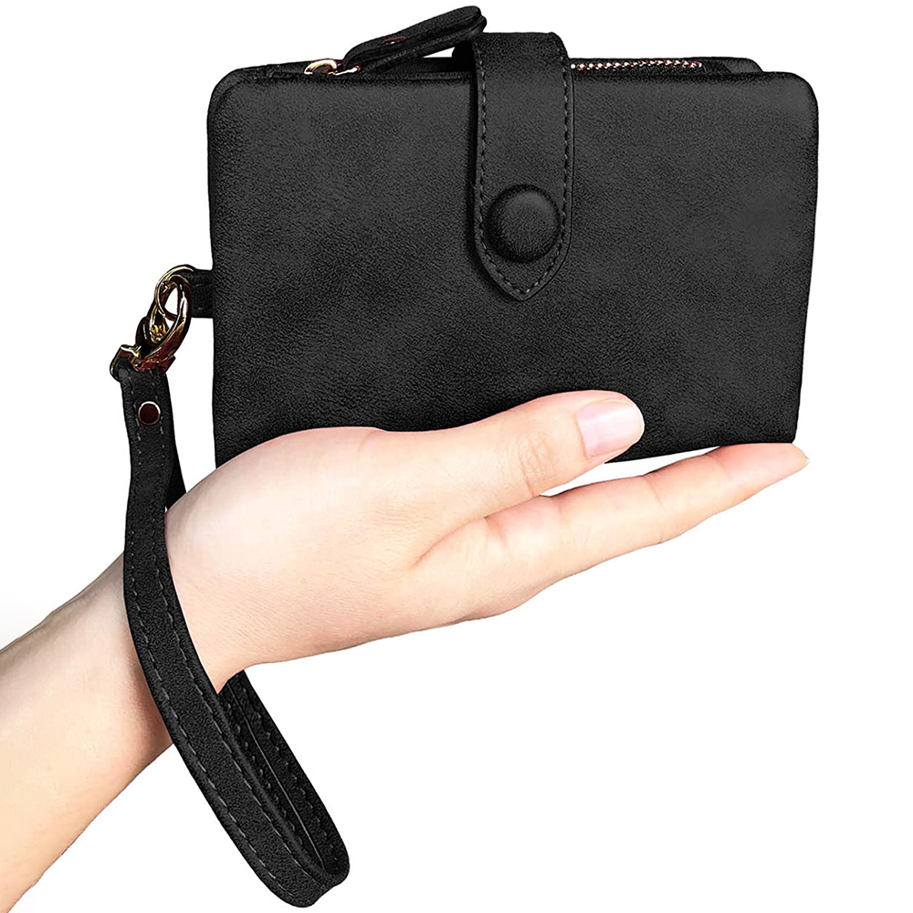 Women's Leather Wallet RFID Ladies Wristlet with Card Holder ID Coin Purse-Black