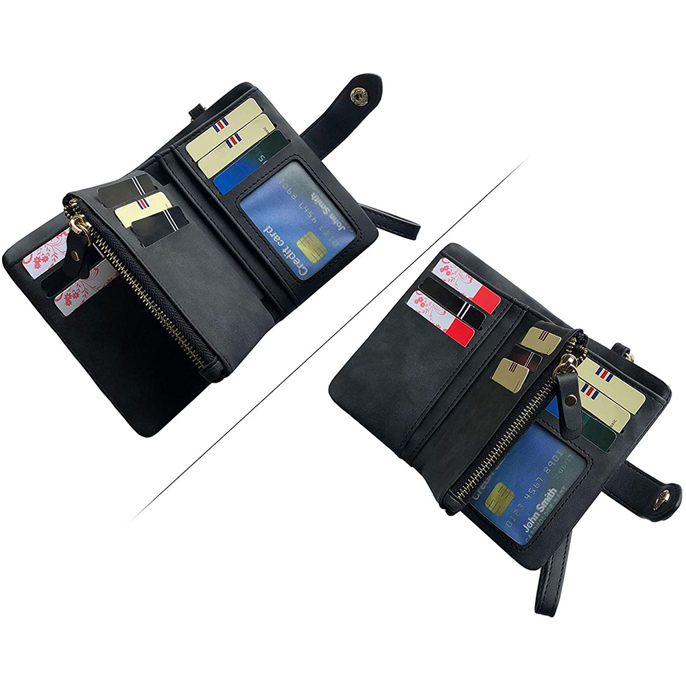 • Functional design:This ladies wallets have 16 card slots (including 1 ID window),1 full-length bill compartments,1 large capacity zipper pocket,1 small zipper pocket for coins,with a wrist strap,holds all your stuffs easily.